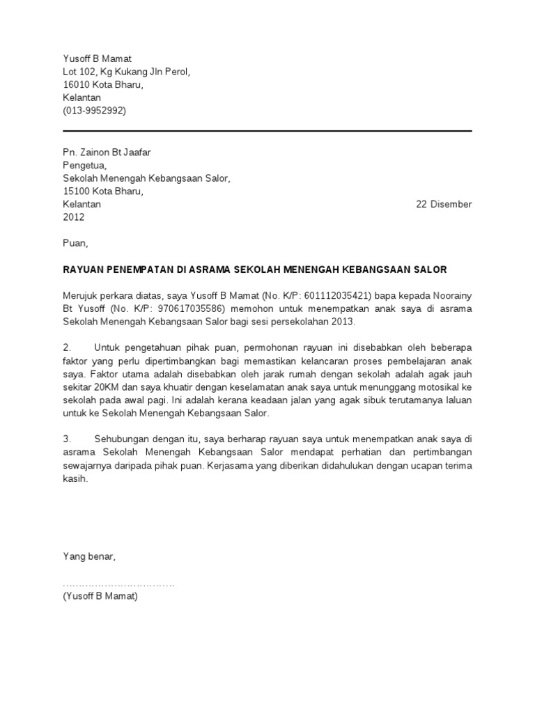 Contoh Surat Rayuan Untuk Pindah Ke Sekolah Smk Tansau
